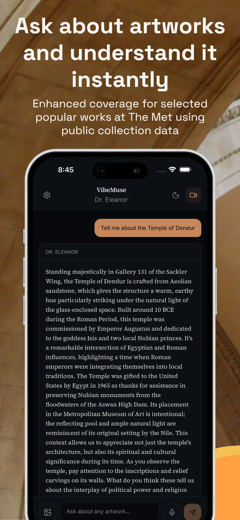 An AI guide for museum visitors — with enhanced coverage for selected artworks at The Met grounded in public collection data, and expanding to museums worldwide. Snap a photo, record a short video, speak, or type — and hear the story in your language.