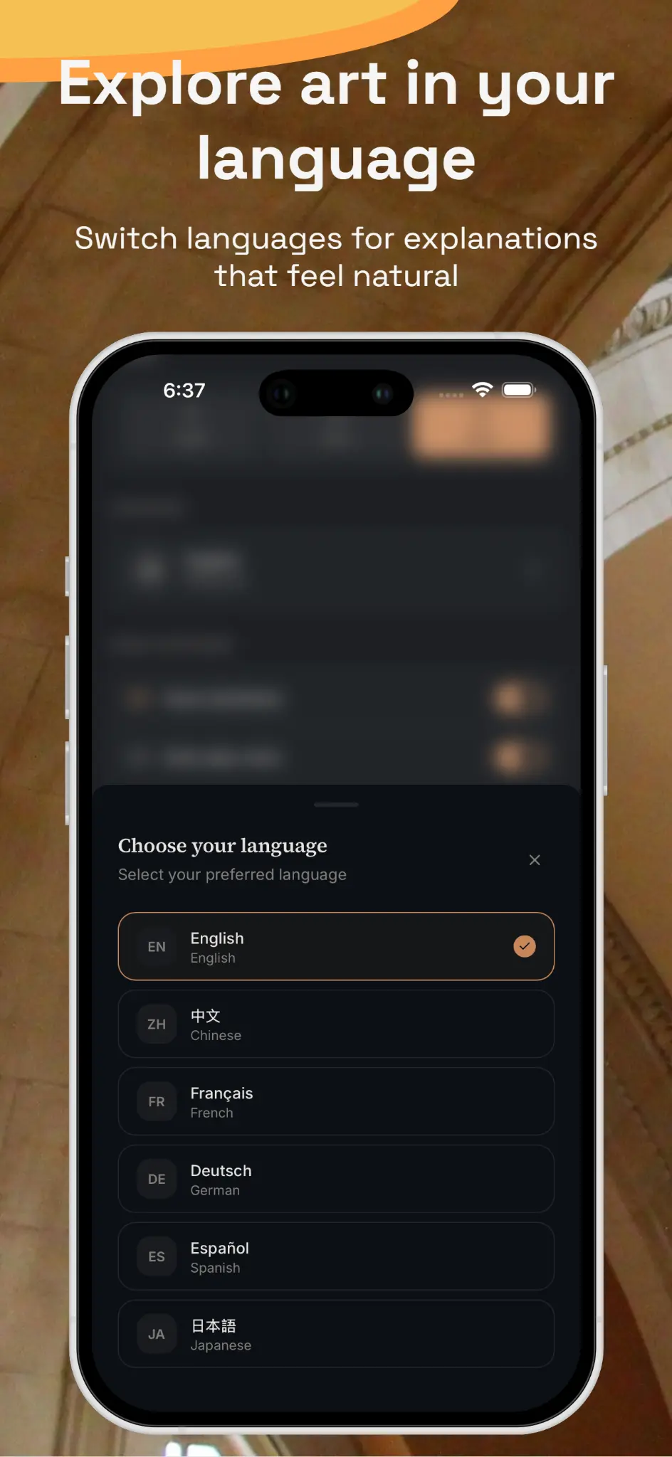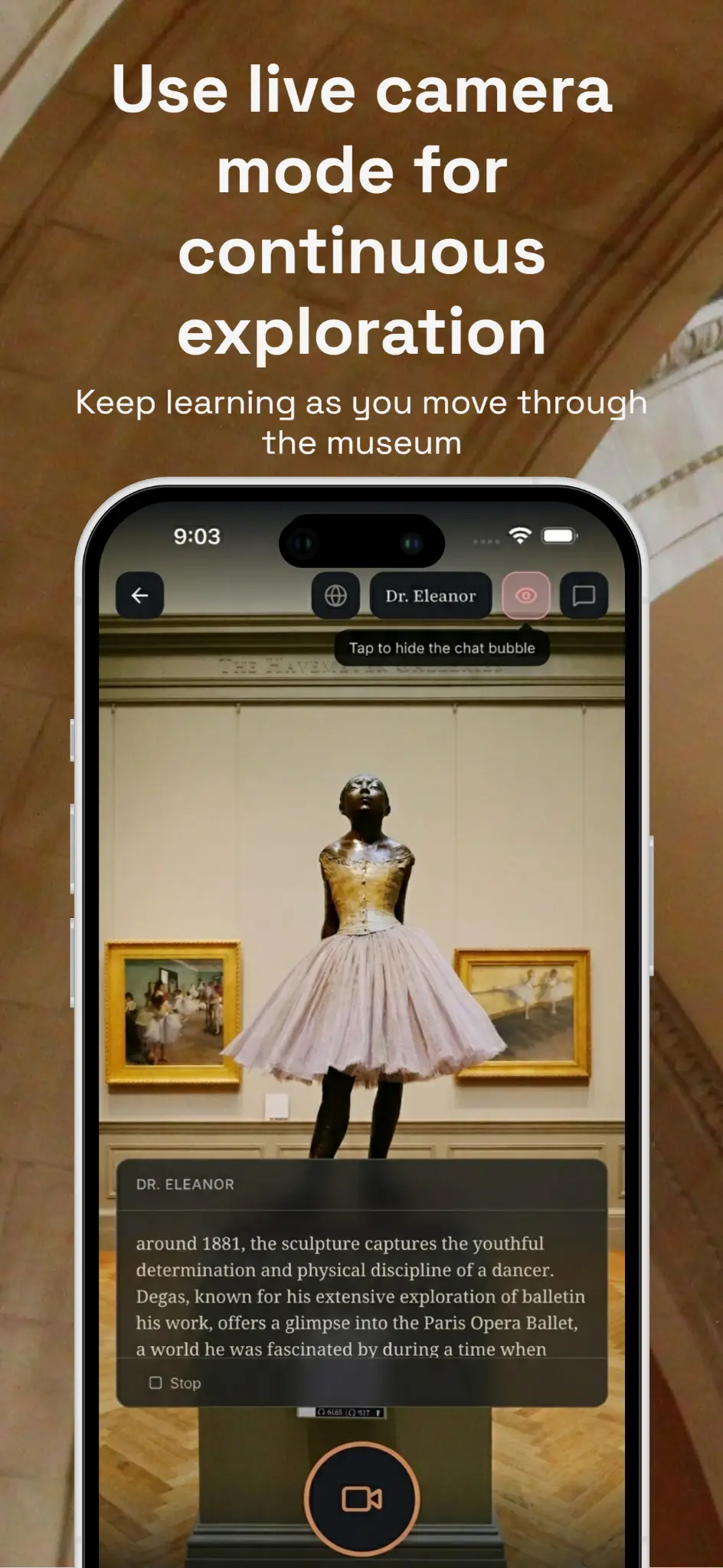Point your live camera or snap a photo of any artwork — paintings, sculptures, architecture.